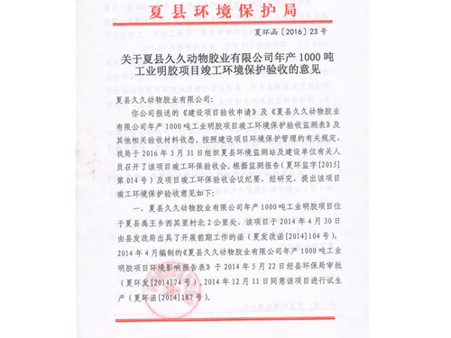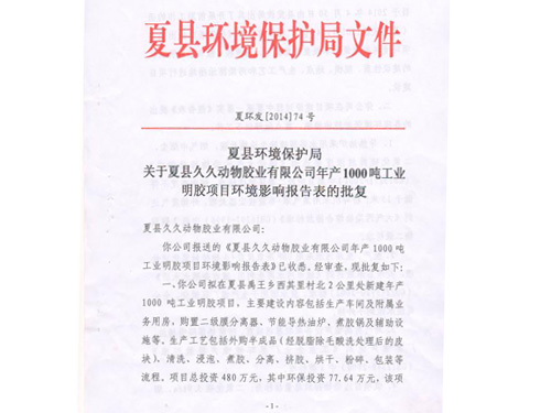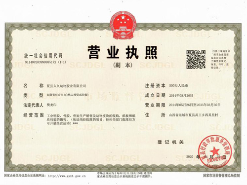 利用杂骨、皮边角料生产的骨胶、明胶。工业明胶、颗粒胶、主要用于金属冶炼、砂轮切割片、砂布、家具的粘合及环保纸袋、纸盒的粘接等行业。夏县久久动物胶业有限公司位于山西省运城市夏县禹工乡西其里村北2公里处。于2014年5月组建,现有职工40人(其中吸纳残疾人15人,无劳动能力者5人)。专业技术人员4人,高专业职称2人。公司总资产达4000万元以上,占地33000多平方米。年生产工业明胶1000吨、颗粒胶1000吨,产值达3500万元以上,年实现利税800万元以上。皮明胶生产项目属于******产业政策。是******资源节约与综合利用政策之资源综合利用目录三,回收综合利用资源生产产品,第39条:利用杂骨、皮边角料生产的骨胶、明胶。工业明胶、颗粒胶、主要用于金属冶炼、砂轮切割片、砂布、家具的粘合及环保纸袋、纸盒的粘接等行业。皮明胶属于动物蛋白胶。